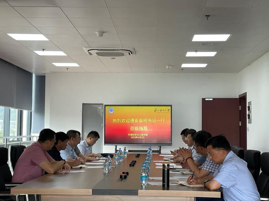 曹岩对柯剑峰书记一行来我校调研表示欢迎,并介绍了学校的基本情况。李大鹏简要介绍了学院的学科发展、师资力量、专业设置、科研团队等方面的情况,重点介绍了城市生活污水资源化利用技术国家地方联合工程实验室、江苏省分离净化材料与技术工程研究中心、水处理技术与材料协同创新中心的研究成果转化以及佛山市南海区苏科大环境研究院的建设情况。柯剑峰表示,介绍了德安县以及德安高新技术产业园区基本情况。他表示,苏州科技大学环境专业在科研成果转化方面积累了丰富的经验,值得学习借鉴,希望双方加强在环保产业方面的深度合作。